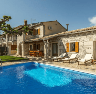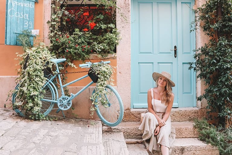 odpolední/večení v uličkách města Rovinj (pastelové ulice, domy, květiny,…)